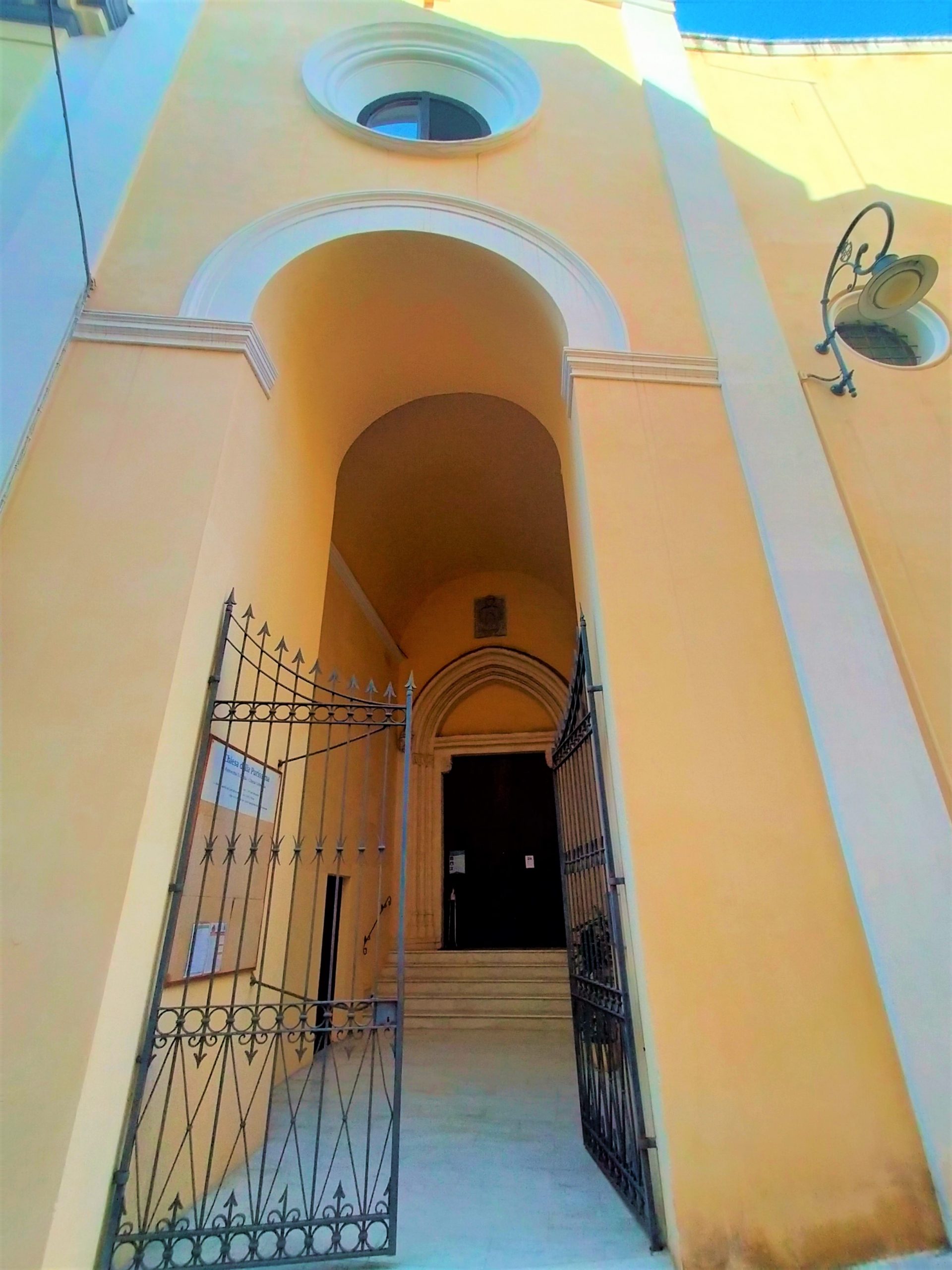 L’ingresso dell’edificio è anticipato da un corpo voltato a botte; mentre il portale d’accesso presenta arco a sesto acuto. L’interno è caratterizzato da stilemi del tardogotico catalano; presenta impianto mononavato diviso in due campate voltate a crociera con gemma centrale, sulle quali si aprono le cappelle laterali.